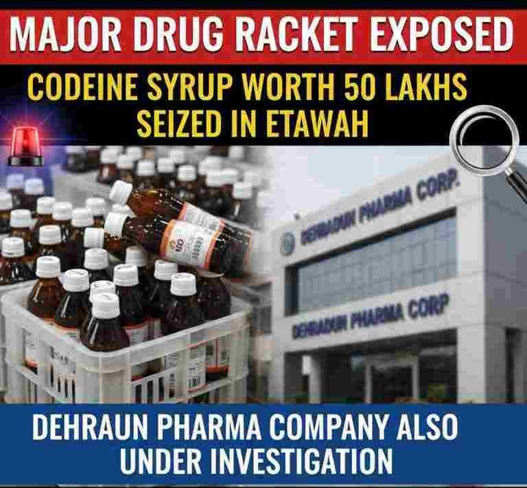 नशे का बड़ा खेल बेनकाब: इटावा में 50 लाख का कोडिन सिरप जब्त, देहरादून की बड़ी फार्मा कंपनी भी जांच के घेरे में